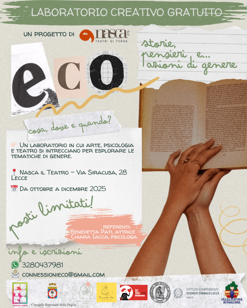 Nel cuore del quartiere 167 di Lecce, a Nasca il Teatro, prenderà vita una serie di incontri laboratoriali aperti a chiunque desideri mettersi in gioco. Saranno momenti di ascolto e confronto, dove creatività, parola e arte diventeranno strumenti per immaginare nuove possibilità.